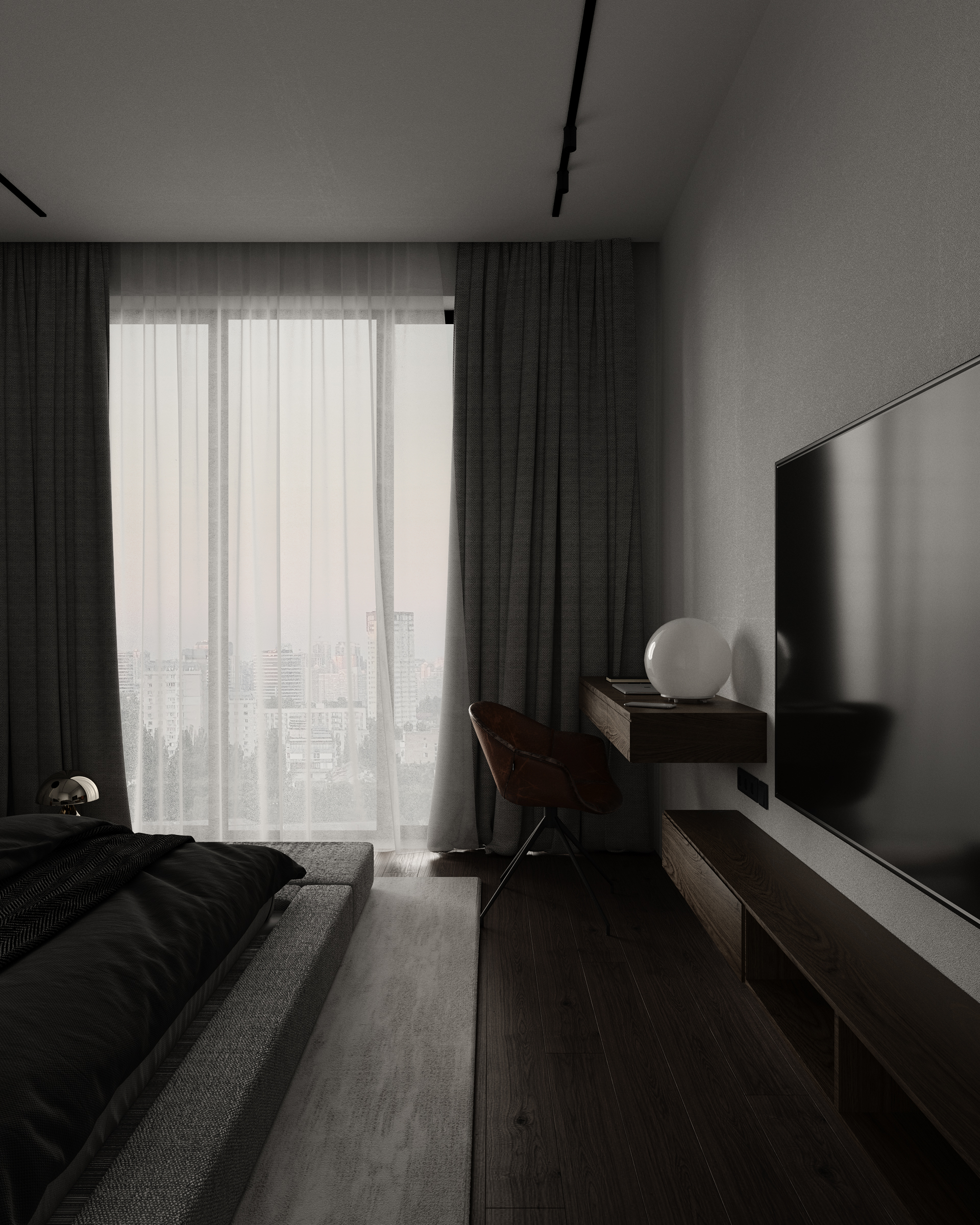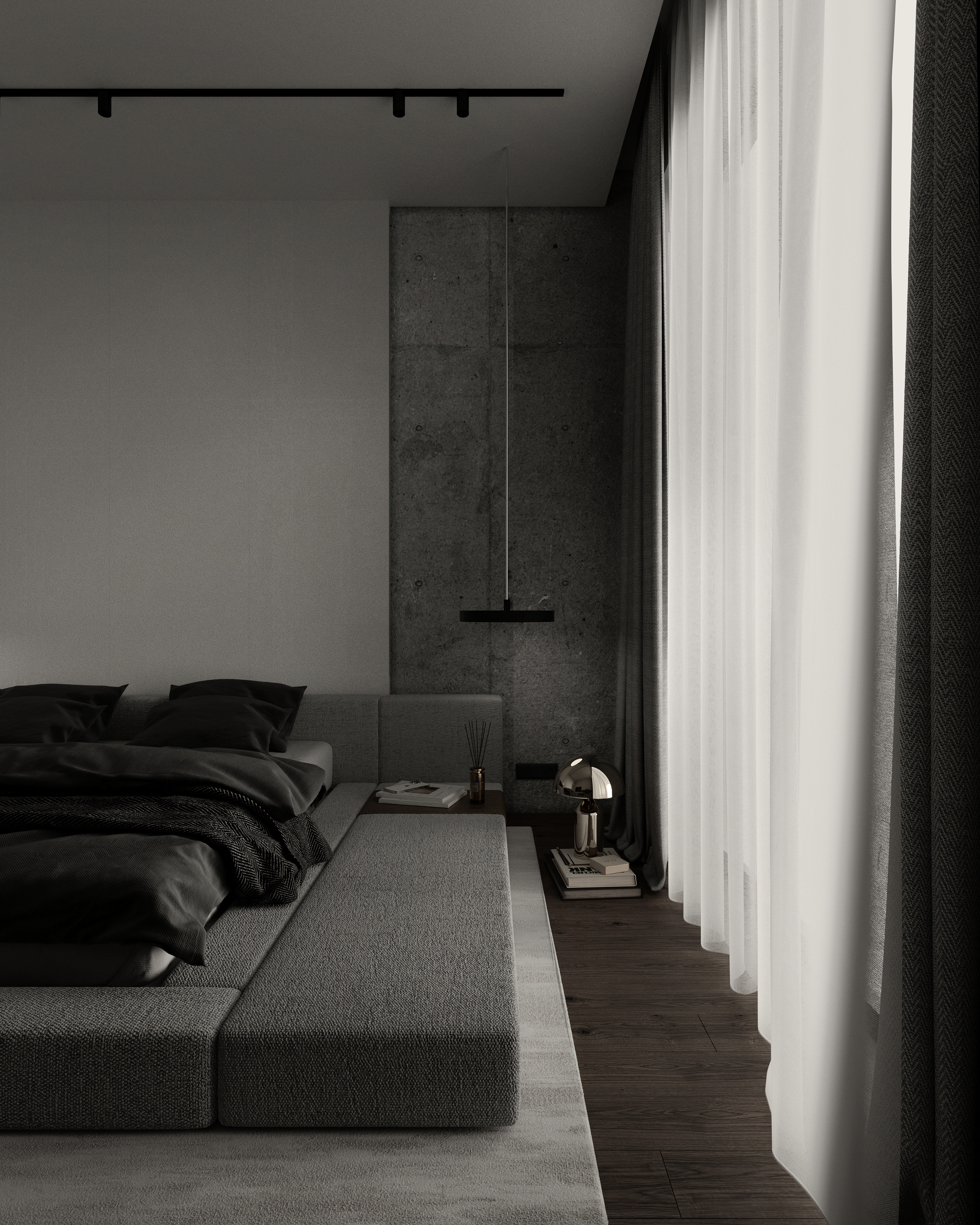 The bedroom must be a soltile place to relax. We used the soft monochrome tones for the bedroom design, yet left some brutal details such as bare concrete wall – to maintain the style of the apartment.
