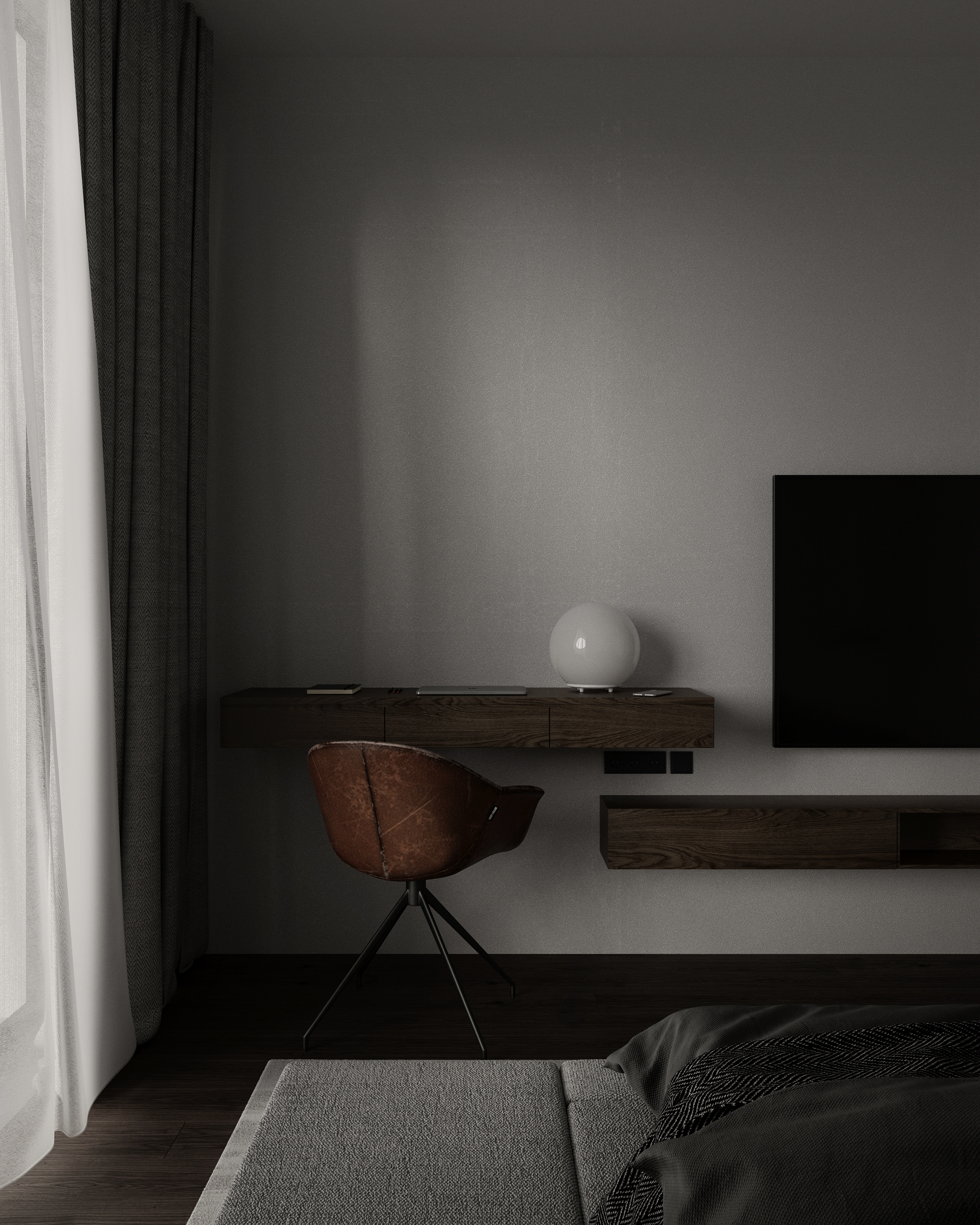 The room can’t be complete without a proper workplace. We went with a clean and comfy corner with a console table and an accent leather armchair.